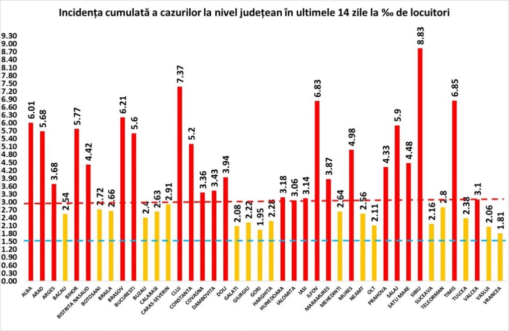 Acesta reprezintă infectările cumulate la 14 zile, raportate la 1.000 de locuitori și este calculat de Direcțiile de Sănătate Publică.